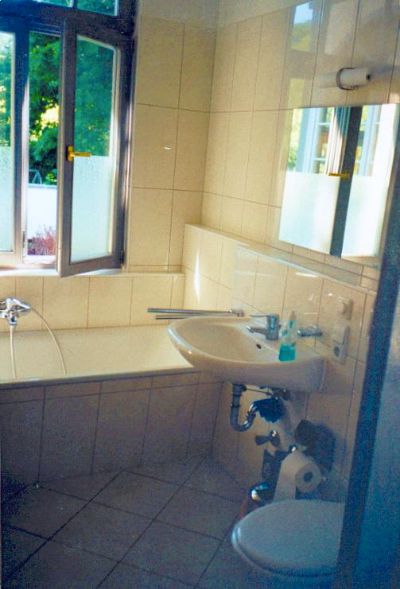 Wannenbad mit Duschkabine, Strahlenheizer, Fußbodenheizung
