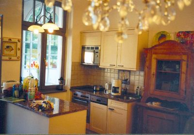 edle Granitküche mit Tresen, Ceranbackherd, Geschirrspüler, Kühlschrank, Mikrowelle, Bauern-Barockbuffett ....