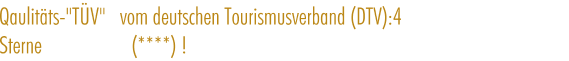 Die am 29.04.2005 durchgeführte Prüfung erfasste 142 europaweit einheitlich vorgegebene Kriterien. Wir erhielten 817 von 899 möglichen Punkten. Zum 5-Sterne-Prädikat fehlte uns im wesentlichen ein Golfplatz und ein Hausdiener auf Knopfdruck.