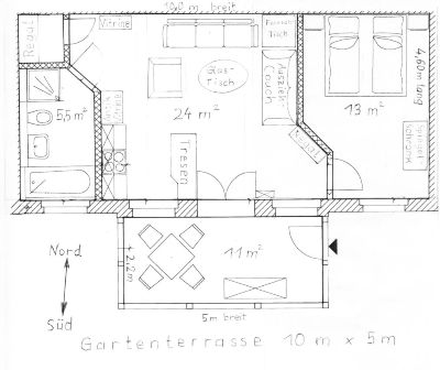 55 qm Wohnfläche: Wohnzimmer 24 qm - mit vollausgestatteter Granit- Komfort-Tresenküche (...Geschirrspüler, Microwelle, Ceranherd...perfekt)